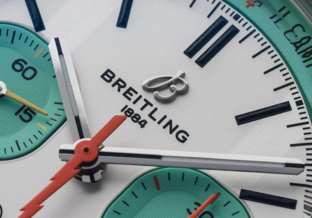 The best clone Breitling Top Time B01 watches Fausto Coppi (AB01768A1A1A1, AB01768A1A1X1) features turquoise sub-dials on a white dial and an orange lightning-bolt-shaped seconds hand. These colors echo Coppi’s Bianchi bike. “Il Campionissimo” is written on this watch’s tachymeter scale, and Coppi’s signature of each cyclist sits on the lower half of the dial, just as Bartali’s does on his LE.