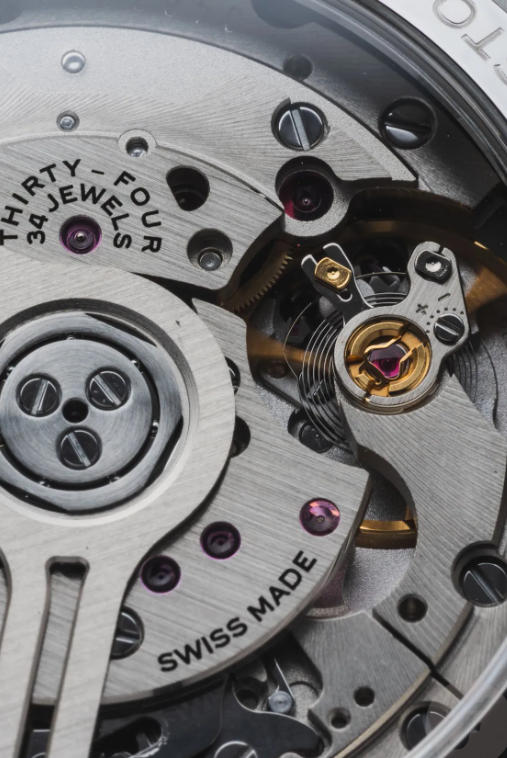Other nice touches are the brushed lines running through the sub-dials, symbolizing the two champions riding side by side. Not-quite-square-nor-round sub-dials at 9 and 3 o’clock indicate the running seconds and chronograph minutes, respectively. The mushroom pushers controlling the chronograph functions look retro and offer comfort to the index finger when using them.