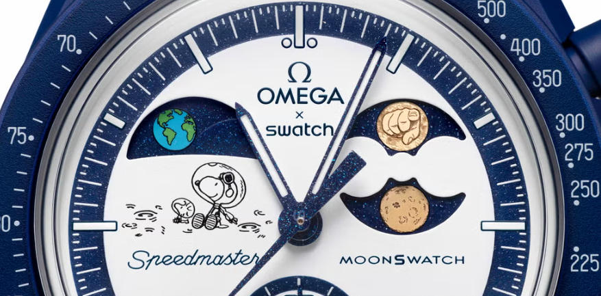 The new perfect fake watches largely mirrors its predecessors—the March 2024 Snoopy MoonSwatch and the September 2025 Harvest Moon edition—retaining the same 42mm asymmetrical Bioceramic case, tachymeter bezel, and dual moon and earth phase indicators. The white opaline dial carries the familiar Omega x Swatch markings, along with Snoopy illustrations and a hidden UV-ink detail showing the beagle thinking: “I beat everybody.”