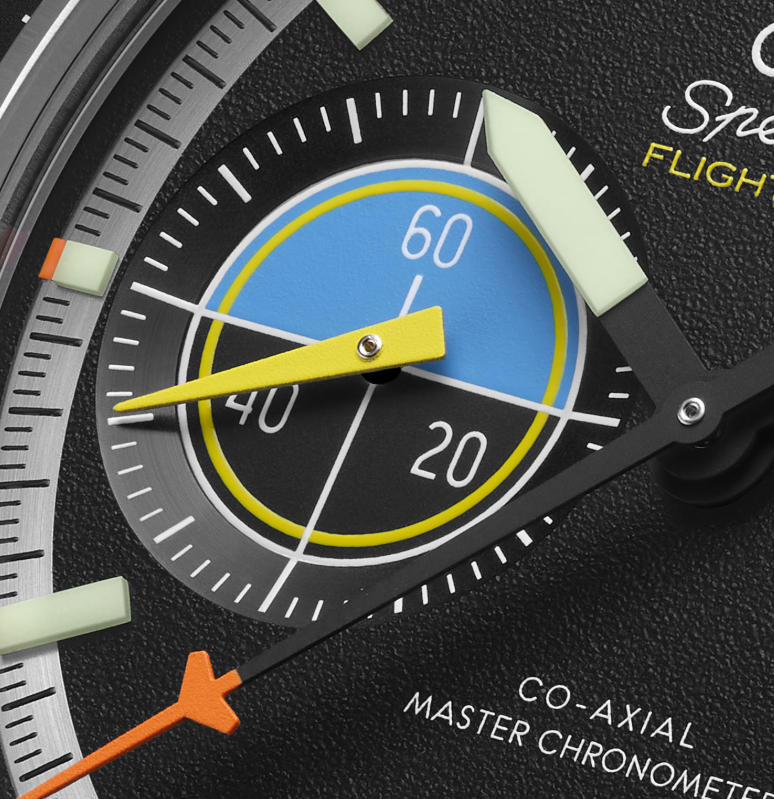 The 1:1 fake Omega Speedmaster Pilot Flight Qualified watches features matte black central hands with either SLN blocks (hours/minutes) or a varnished orange aeroplane tip (central seconds). The most eye-catching elements are the sub-dials. The 3 o’clock sub-dial, used for the chronograph indications, features a triangular matte orange hand and transferred white numerals, as well as graduations that mimic the “burn rate” indicator in aircraft cockpits. The 9 o’clock small seconds comes with a target/sight aesthetic inspired by cockpits, featuring a varnished matte yellow hand and artificial horizon in blue.