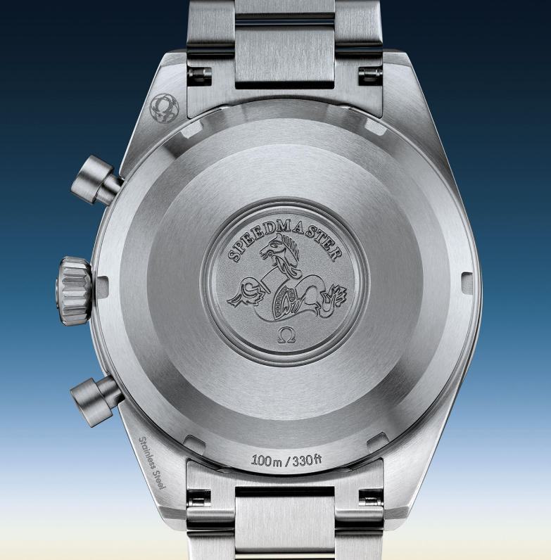 Inside the case is the in-house, automatic calibre 9900. A modern and highly technical movement, it has an integrated architecture with column wheel and vertical clutch. It is also a Master Chronometer calibre certified by METAS, with Co-Axial escapement, free-sprung balance and silicon balance spring. It is thus capable of great accuracy and magnetic resistance. Equipped with barrels mounted in series, it can store up to 60 hours of energy and also comes with a practical time zone function for the hour hand – which comes in handy for pilots crossing time zones while flying without disturbing other timekeeping indications. The movement here sits behind a solid caseback with the Speedmaster’s traditional Seahorse medallion.